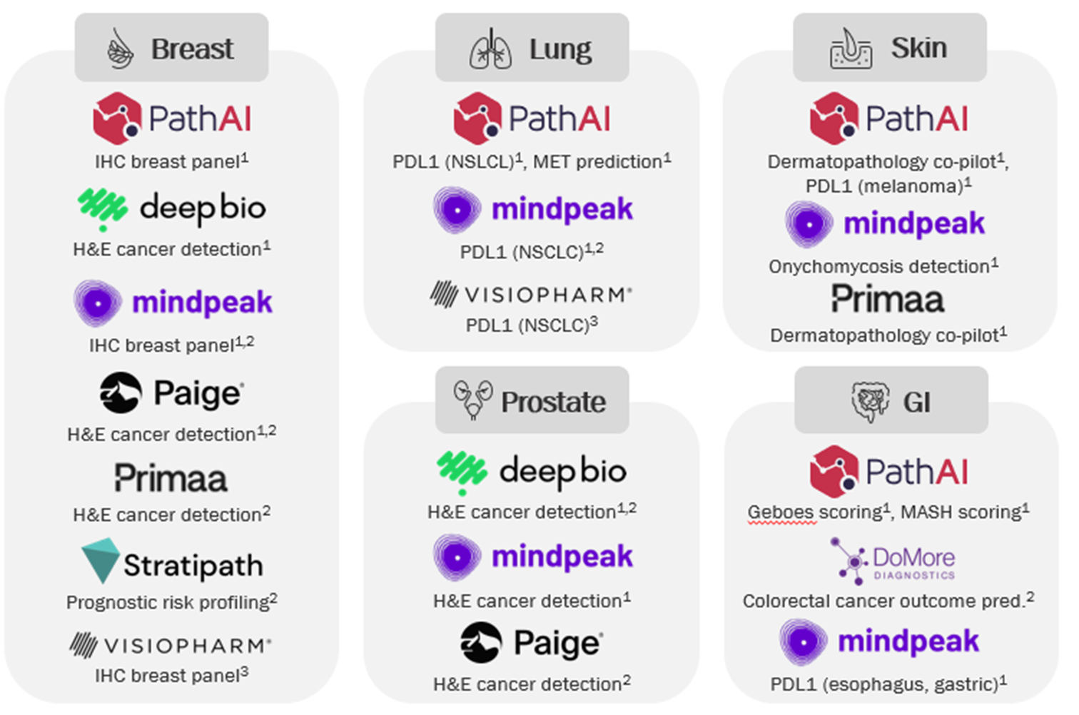 AISight Dx obsahuje rostoucí seznam aktuálně více než 40 algoritmů od předních světových vývojářů. Jsou plně integrovány do jednoho prohlížeče a v celém pracovním postupu podporované AISight Dx.