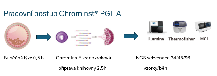 ChromInst® PGT-A je řešení využívající technologii rychlé přípravy single cell knihovny ChromInst® v kombinaci s technologií sekvenování nové generace (NGS) ke screeningu abnormalit 23 párů chromozomů, mezi které patří aneuploidie, delece a duplikace u embryí.