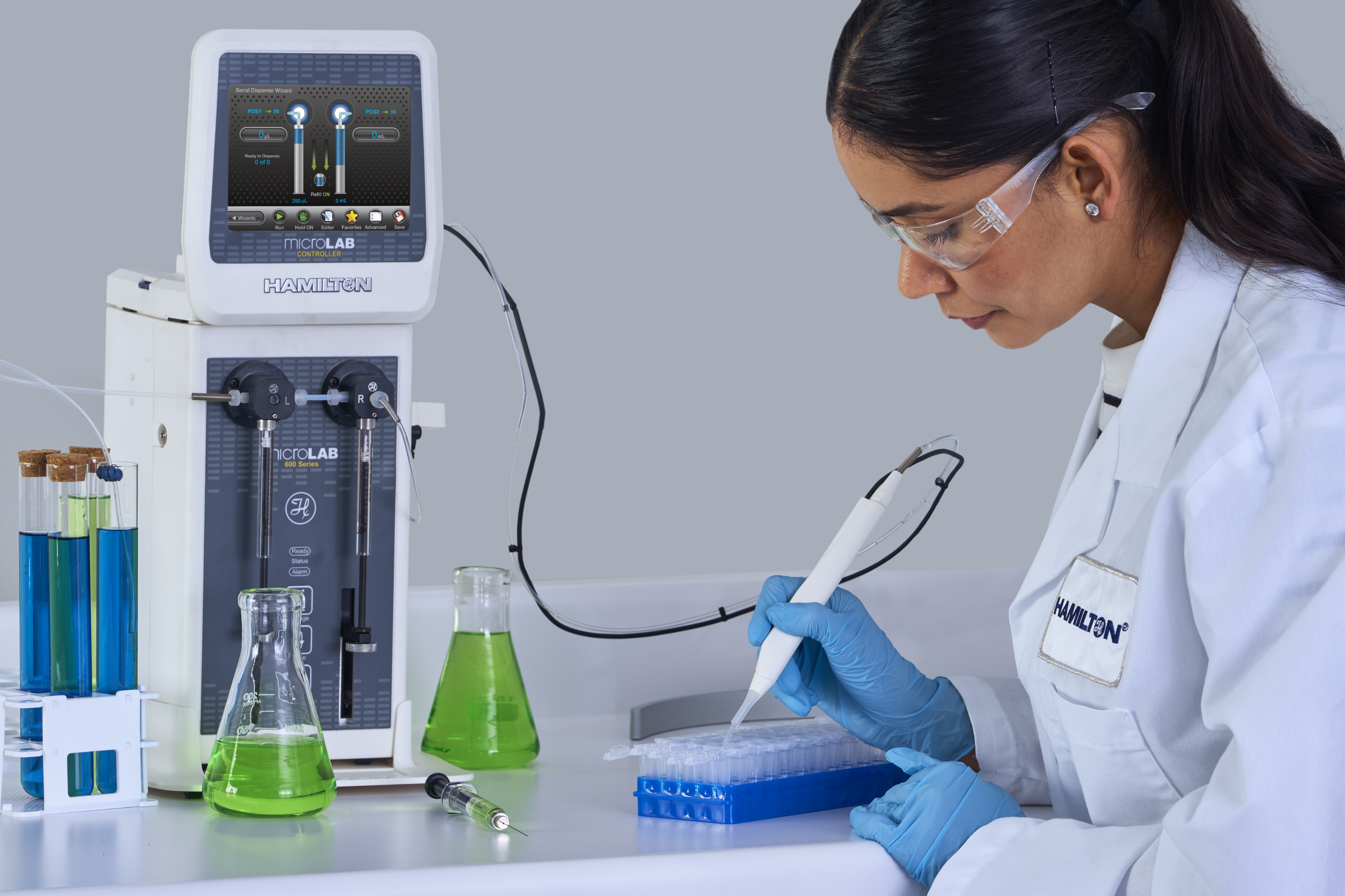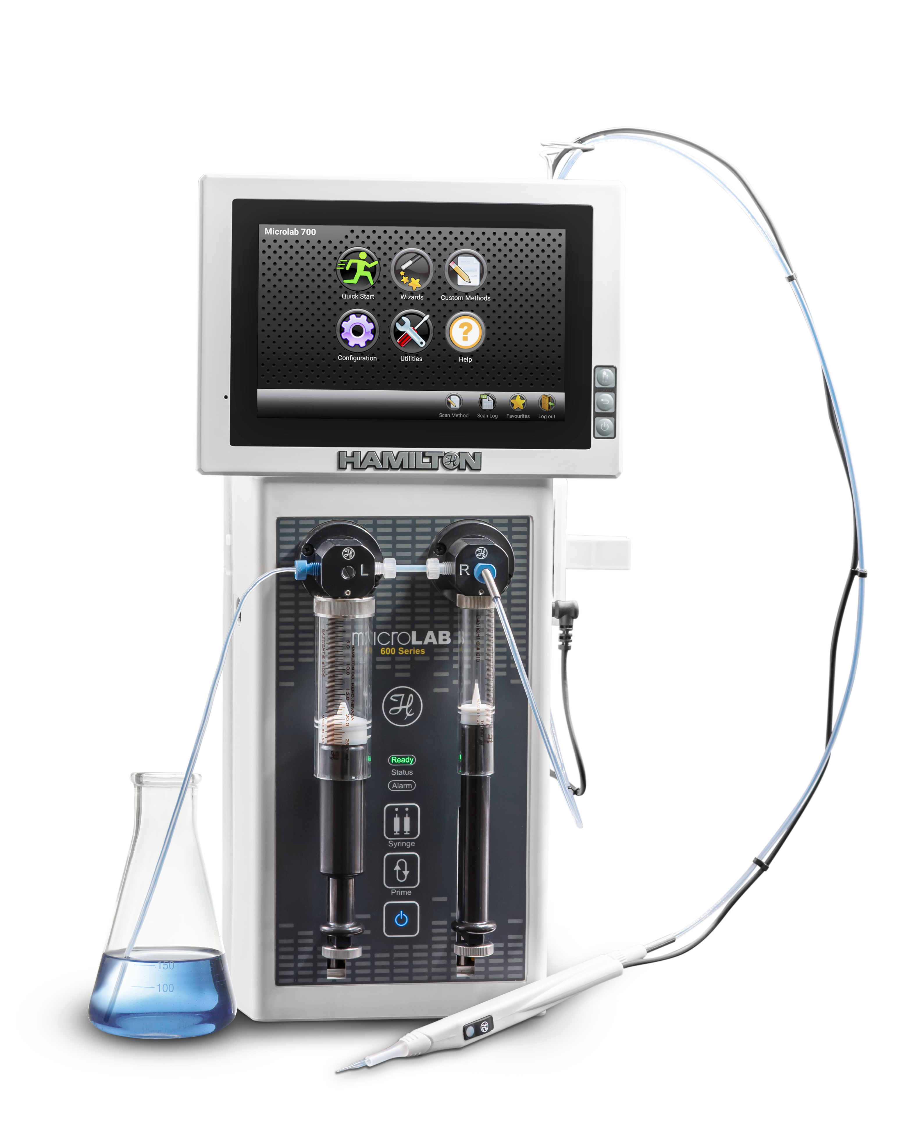 Řada Microlab 600 (Obr.1.) představuje osvědčený standard pro rutinní laboratorní aplikace. Systém se skládá z řídicí jednotky, pohonu stříkaček a fluidního modulu a umožňuje konfiguraci podle konkrétní úlohy.